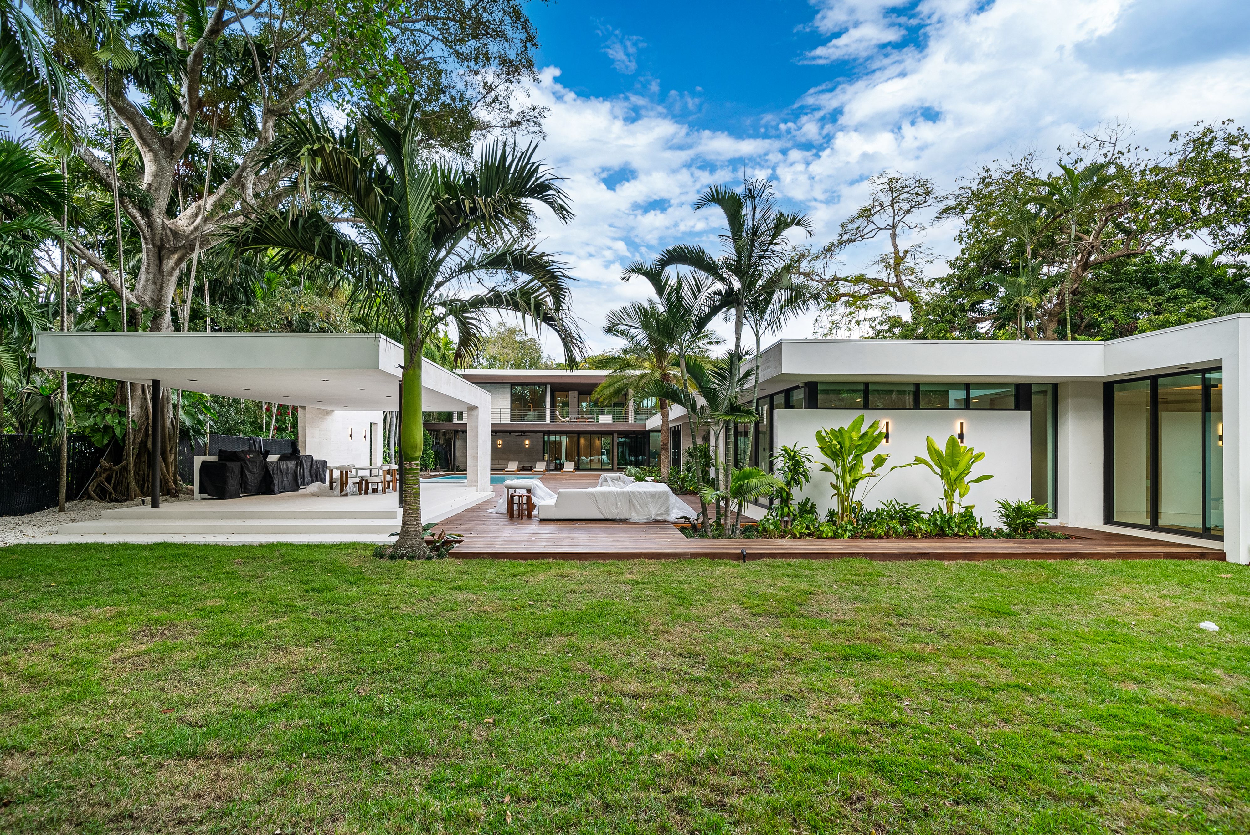 Contemporary style home in lush Coconut Grove. Light-filled interiors with volume ceilings, flow seamlessly to expansive outdoor covered summer kitchen & tropical heated pool/spa in the middle of the luxurious nature.